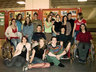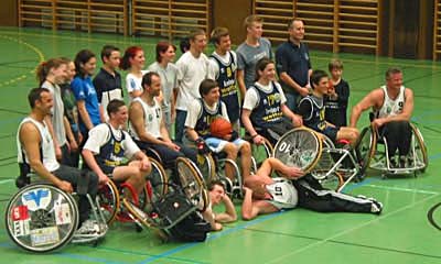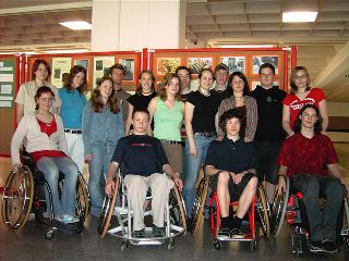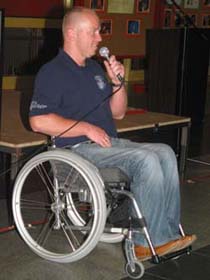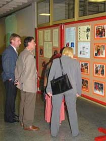 Menschen Wirklichkeit wird. Oben mitte: Bez.Hauptmann Hr. Mag. Johann Lampeitl betont wie wichtig solche Projekte sind. Daraus können wir erkennen, wie behindertengerecht Städte sind und was noch verbessert werden muß. Unten links: Ein Basketballspieler der Sitting Bulls Klosterneuburg teilt uns mit wie wichtig uneingeschränktes weiterkommen für Rollstuhlfahrer in einer Stadt ist. Als gut trainierter Sportler ist es für ihn ganz leicht über Gehsteigkanten zu kommen. Hingegen brauchen nicht trainierte Menschen Hilfe, diese Stufen zu bewältigen. Unten rechte: Besucher betrachten mit Obfrau Gerlinde Zickler mit großem Interesse die ausgearbeiteten Fotos auf den Schautafeln. |
